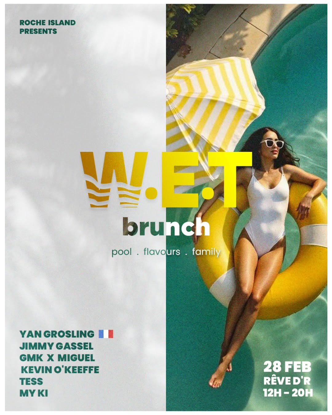 Plongez dans la première édition du W.E.T Brunch, un nouveau concept de style de vie en journée conçu pour les amis, les couples et les familles afin de célébrer le soleil. Organisé dans le magnifique hôtel Le Rêve d'R, cet événement associe une ambiance de fête au bord de la piscine à un délicieux déjeuner et à un programme de musique house de qualité avec Yan Grosling, Jimmy Gassel et bien d'autres. Pendant que les parents dansent sur des rythmes soulful house et afro ou s'amusent avec des canons à mousse, les enfants sont pris en charge dans un espace dédié avec des structures gonflables et des nounous sur place. C'est l'ultime expérience dominicale "feel good", où l'accent est mis sur des moments simples et authentiques, en bonne compagnie.