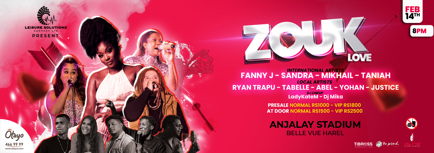 Le 14 février, le stade Anjalay se transforme en capitale du romantisme pour une nuit de la Saint-Valentin légendaire. Avec en tête d'affiche l'emblématique Fanny J, la soirée promet un tourbillon de rythmes zouk avec les stars internationales Taniah, Sandra Esparon et Mikhail Hoareau. Ils sont rejoints par un groupe local passionné composé d'Abel, Ryan Trapu, Justice et d'autres pour maintenir l'énergie jusqu'au petit matin. Que vous soyez un couple cherchant à danser de près ou un célibataire prêt à se mêler à la foule, attendez-vous à une atmosphère chaleureuse et festive où la musique parle d'elle-même.
